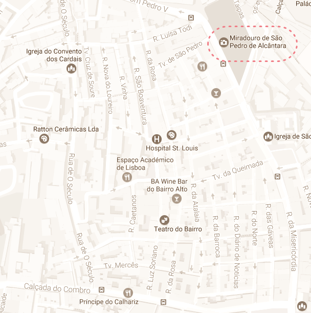 Situado en el Bairro Alto, el mirador de San Pedro de Alcántara ofrece unas vistas preciosas de Lisboa. Desde él podréis contemplar El castillo de San Jorge, el barrio de la Baixa y de Alfama, así como el Tajo a la derecha de la ciudad. Las mejores vistas son al atardecer, aunque es un lugar muy concurrido por los turistas.