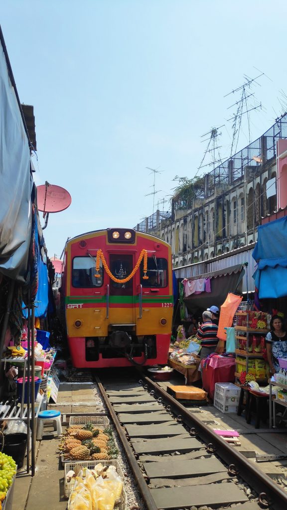 El mercado flotante, nos pareció que estaba destinado exclusivamente para el turista y no nos gustó demasiado. No así como el mercado sobre las vías del tren, que fue una experiencia única. Ver como recogen en unos segundos todo el mercado, y como pasa el tren por encima de los productos, casi rozando a la gente que se agolpa a los lados.