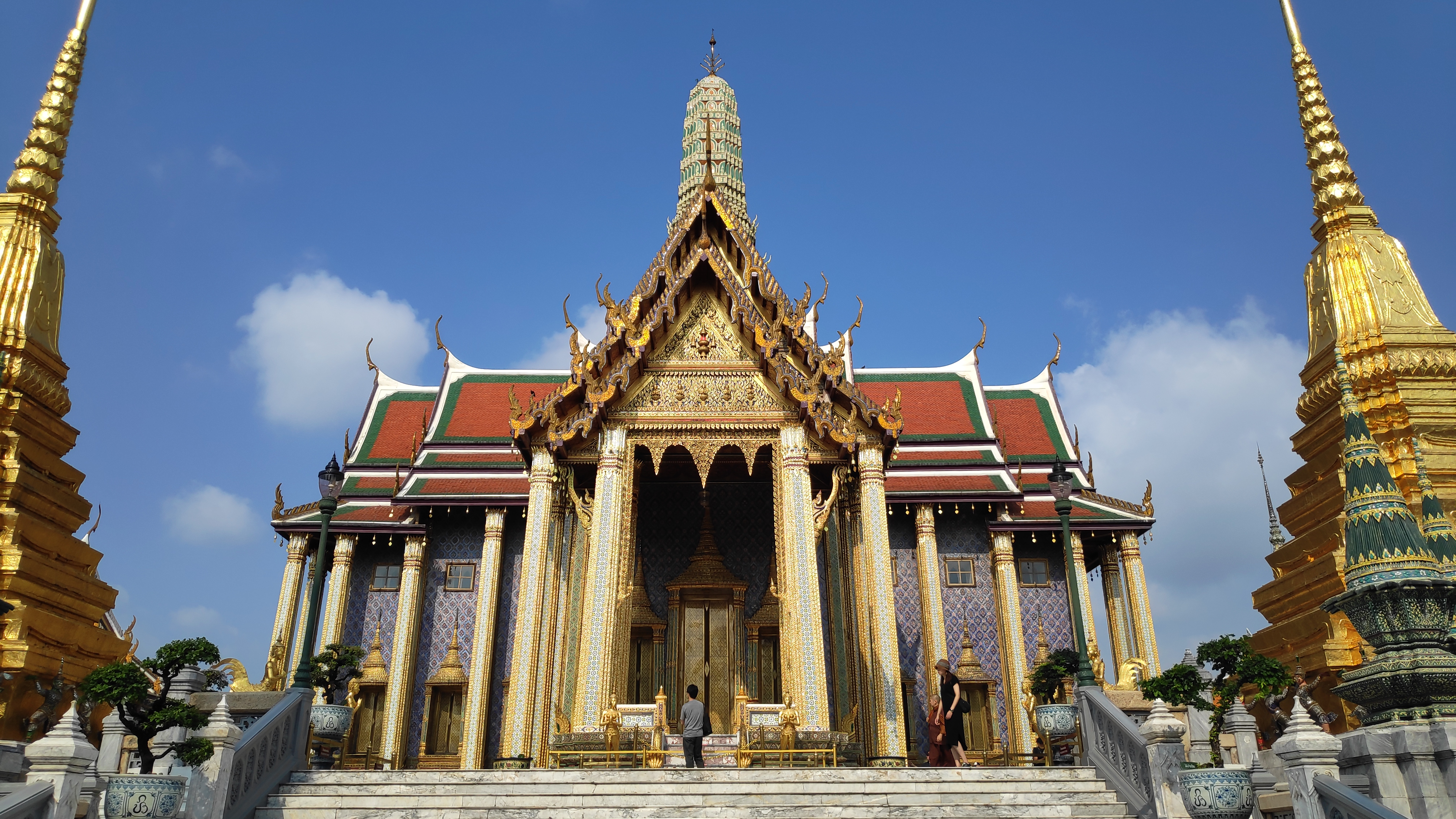- Gran Palacio. Entrada 500 bahts. Antigua residencia de los reyes y el templo más visitado. Alberga al Buda Esmeralda, el más venerado. Puede resultar un poco agobiante ya que suele haber muchísima gente. Recomiendo visitarlo nada más abran. (8:30 am). La política de vestimenta es bastante estricta por lo que si deseas entrar deberás vestir con las rodillas y hombros cubiertos, los pantalones no pueden estar rotos, prohibidos los croptops y los grandes escotes.