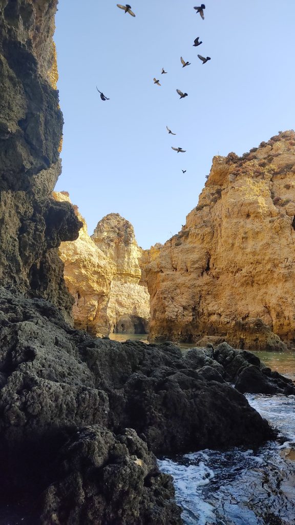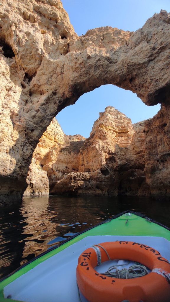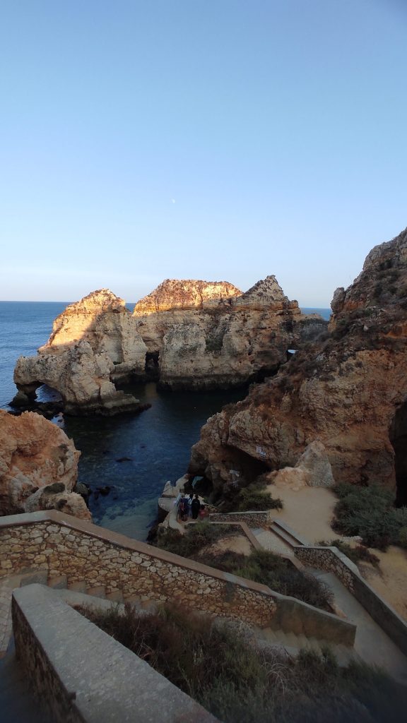 En esta playa encontraréis restaurante y parking gratuito junto a las escaleras. También tenéis la posibilidad de coger una pequeña barquita y recorrer la costa, entrando dentro de cuevas y grutas desde allí hasta pasado Punta da Piedade. El paseo son 15€ por persona y dura unos 45 minutos. Es recomendable hacerlo a primera hora para que no haya muchas embarcaciones. El paseo se realiza todo el tiempo en la embarcación.