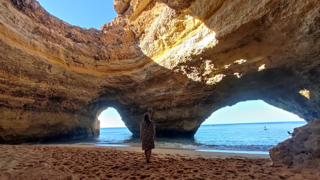 Una de las joyas de la corona y una de las fotos más utilizadas como reclamo en el Algarve. La cueva de Benagil se encuentra a escasos metros de la playa del mismo nombre. A ella se puede acceder nadando (nosotros lo hicimos así), con kayak o paddle que podéis alquilar en el pueblo o a través de excursiones que salen desde diferentes puntos de la zona y visitan playas como la de Marinha y Benagil. Hay que tener en cuenta que si queréis disfrutar de ella desde la arena, en la mayoría de los tours en barquito no se puede bajar, pero es una muy buena opción para visitar la zona.